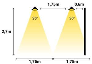 Tänk på att ljuset från en spotlight inte har exakta skarpa kanter, det finns mycket ljus även utanför den teoretiska ljuskäglan. Därför behöver inte ljuskäglorna i illustrationen överlappa, för ljuset kommer överlappa ändå och man får ett jämnt ljus på golvet.